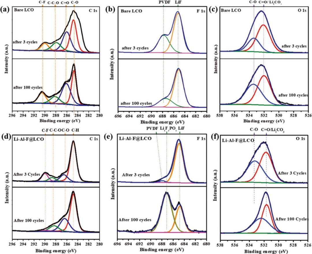 圖6.Bare-LCO和b)Li-Al-F@LCO循環(huán)3次和100次后的XPS光譜:a,d)C1s,b,e)F1s和c,f)O1s