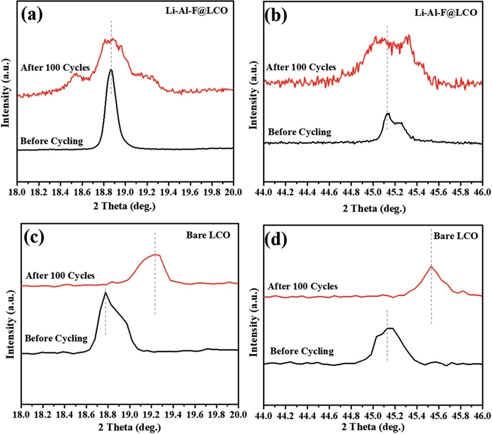圖7.循環(huán)100次前后的a,b)Li-Al-F@LCO和c,d)Bare-LCO電極的(003)和(015)衍射