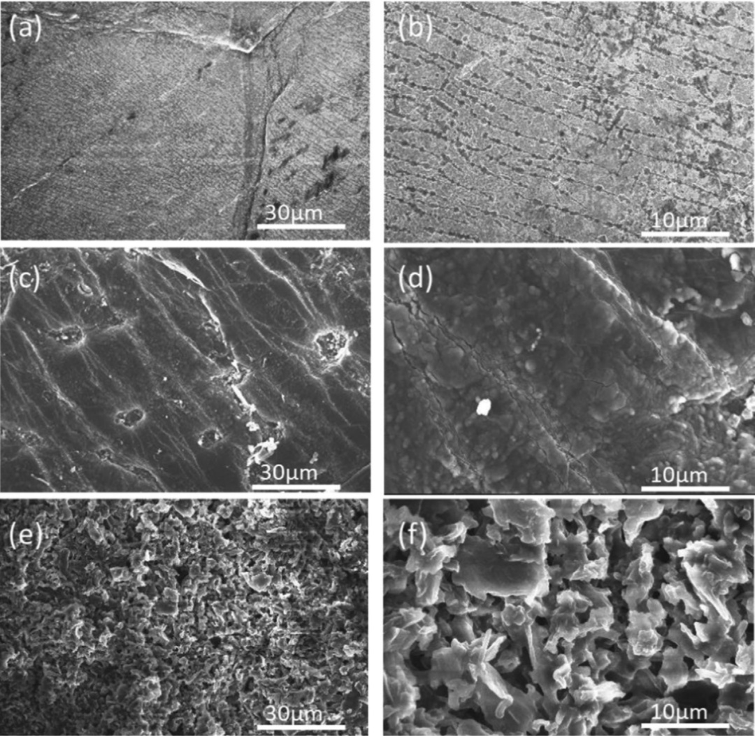 圖10.Li負(fù)極的SEM圖像:a,b)循環(huán)前和c,d)在FEC/DFEC以及e,f)常規(guī)EC基電解質(zhì)溶液中循環(huán)100圈后