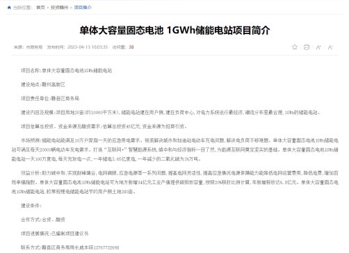 江西贛州擬投建單體大容量固態(tài)電池1GWh儲(chǔ)能電站