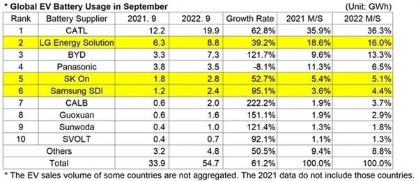 9月全球電動汽車電池裝車榜:寧德時代第一,比亞迪退居第三